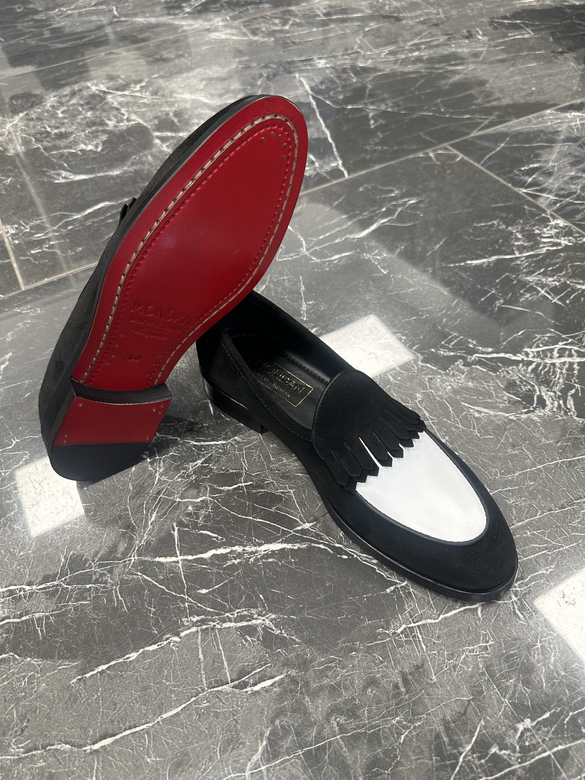 Die Herrenschuhe vom Hause MONDÄN – L’Art de l’Élégance werden von versierten Händen aus edlen sorgfältig ausgewählten Materialien mit einzigartiger Design- bzw. Formsprache gefertigt. Passion zum Detail und handwerkliche Qualität stehen im Vordergrund. Das handgearbeitete Modell “Zebra” ist mit Fransen versehen und aus schwarzweißem Leder hergestellt.